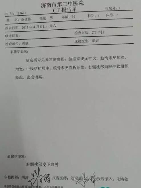濟(jì)南市第三中醫(yī)院CT報(bào)告單顯示,趙先生右側(cè)枕部局限性軟組織隆起,密度增高。趙先生的同事周先生對記者說:“看著朋友被打成這樣,我心里很過意不去,所以我現(xiàn)在到醫(yī)院照顧他。”