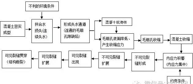 作者在攪拌站成立之初的抗裂實踐中,對這些現象也深感困惑。直到后來明確了早期裂縫是因為混凝土失水過多所致,并對這一機理進行了深入研究,才重新認識了混凝土收縮裂縫形成的全過程,如圖1[5]所示。