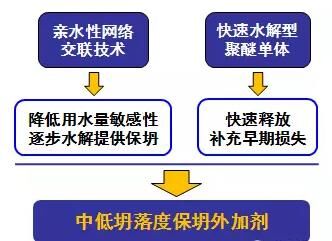 綜合來(lái)講,PCE減水劑在配制中低坍落度混凝土方面提供了有效技術(shù)保障。中低坍落度減水劑作用技術(shù)線路圖如下圖所示: