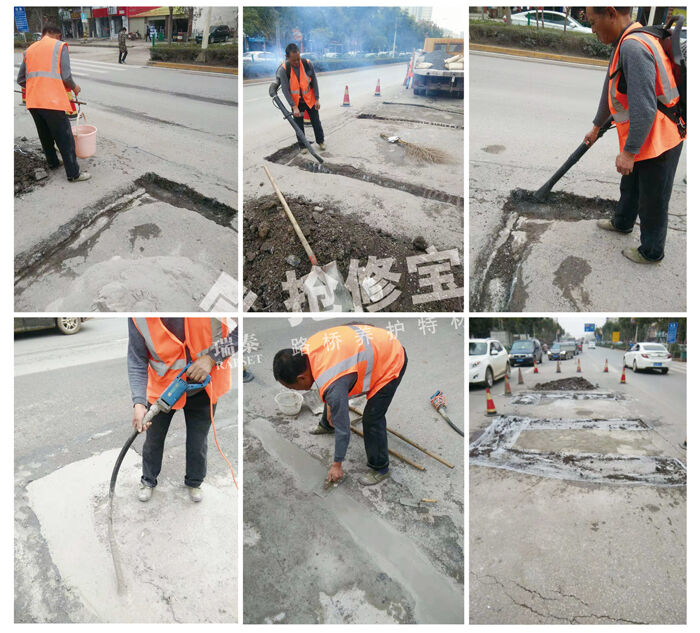 以使用搶修寶水泥路面修補(bǔ)料RT-2為例來說明。使用搶修寶水泥混凝土路面修補(bǔ)料修補(bǔ)病害非常簡單,首先在修補(bǔ)前,一定要對水泥混凝土路面坑槽進(jìn)行清理,然后再用高壓水槍沖刷干凈,沖刷后用風(fēng)槍將明水吹干,保持濕潤狀態(tài);隨后根據(jù)坑槽的深淺,按施工比例充分?jǐn)嚢栊扪a(bǔ)料,攪拌后攤鋪于坑槽部位收光養(yǎng)護(hù)即可。搶修寶水泥路面修補(bǔ)料的粘結(jié)力表現(xiàn)、抗壓耐磨表現(xiàn)、無收縮無老化表現(xiàn)均良好,修補(bǔ)后材料不易脫落不易老化,使用壽命長,可以一次性修復(fù)水泥混凝土路面坑槽病害,恢復(fù)路面美觀及功能。