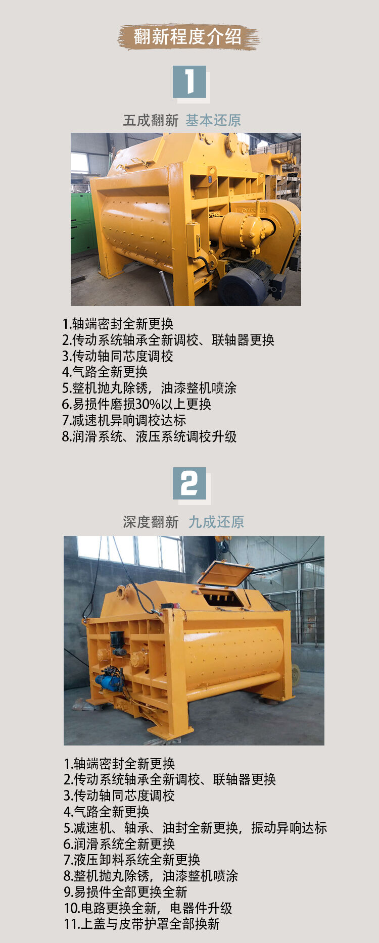 隨著國家基礎建設的大力推進,攪拌站轉場的速度也在加快,有些攪拌機使用2-3年就被閑置,未能發(fā)揮出他的最優(yōu)性能。一些攪拌機的主要部件性能任然很好。為了將這一部分設備重新利用,我公司擁有專業(yè)的人員、評估、回收、檢修、然后再以嶄新的面貌服務客戶。